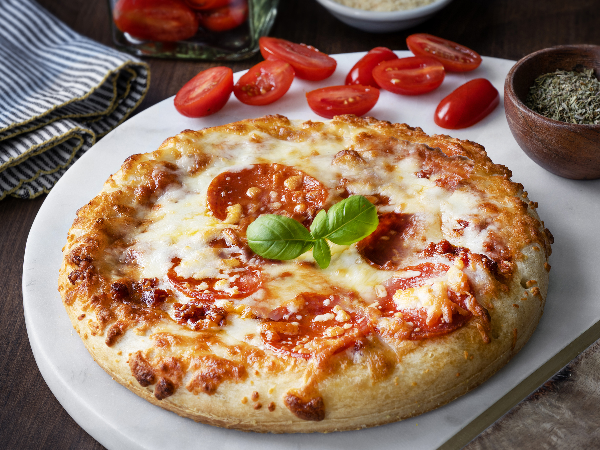 We also offer French bread pizzas, stuffed crust options, breakfast pizzas, and pizza bagels.
